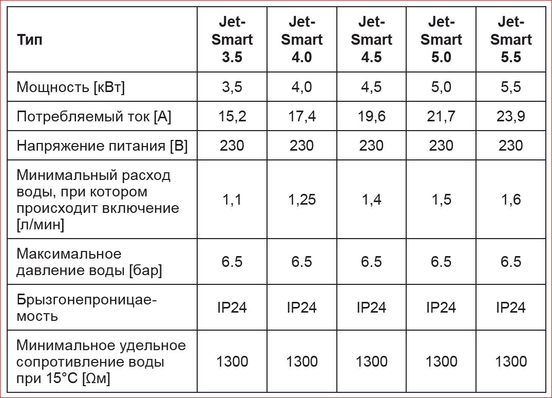 Модельный ряд линейки JET-SMART включает водонагреватели мощностью 3.5, 4.0, 4.5, 5.0, 5.5 кВт.